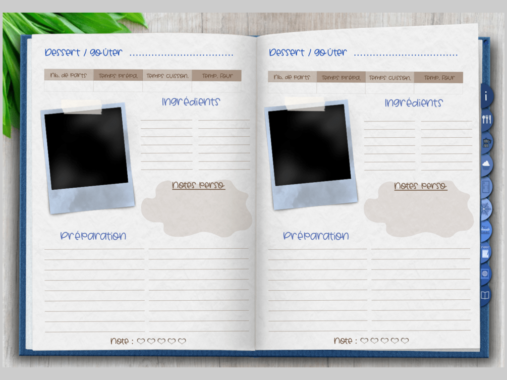Des pages pour vos "Petits Déjeuners" et "Desserts et Goûters" sont également présentes.